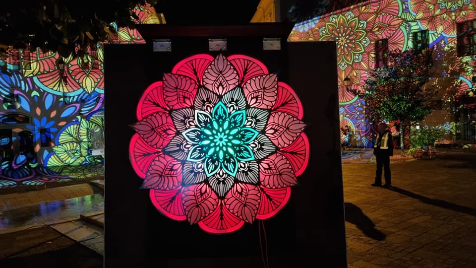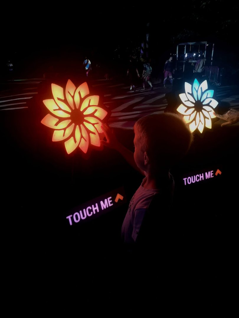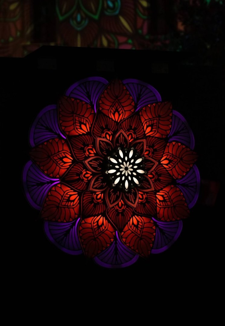 Glowing mandala with 37 touch sensitive sensors playing animations based on touches.