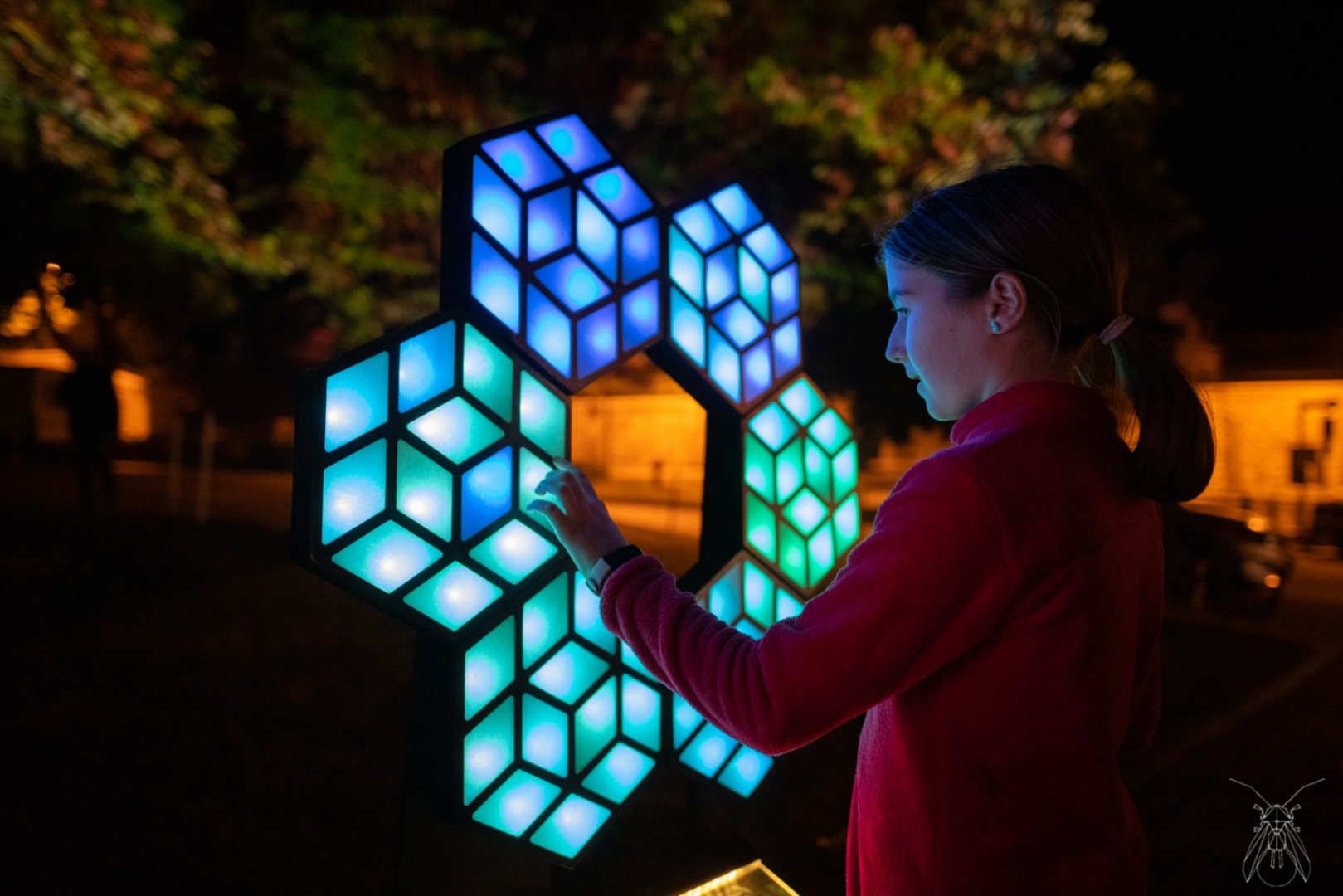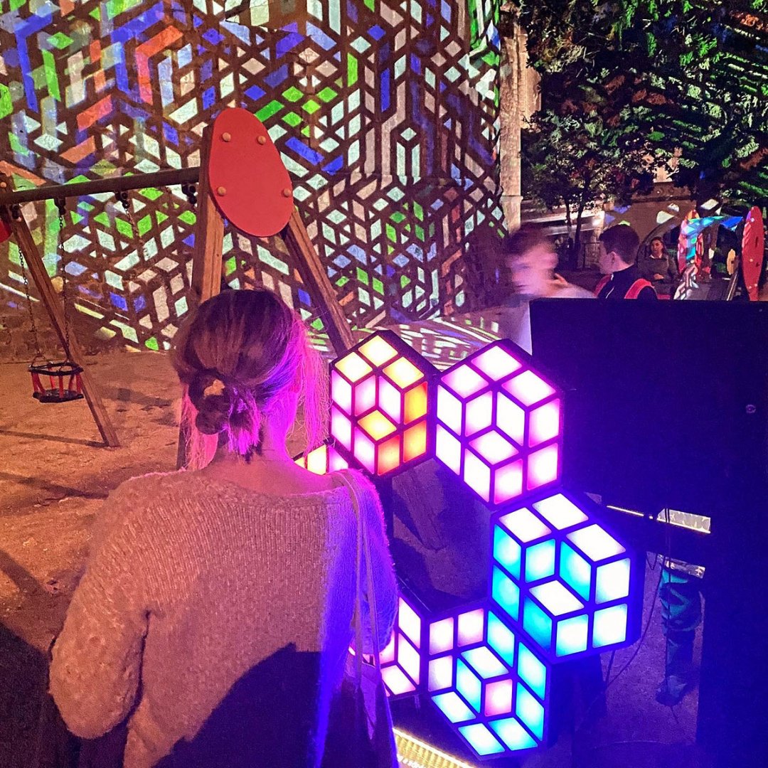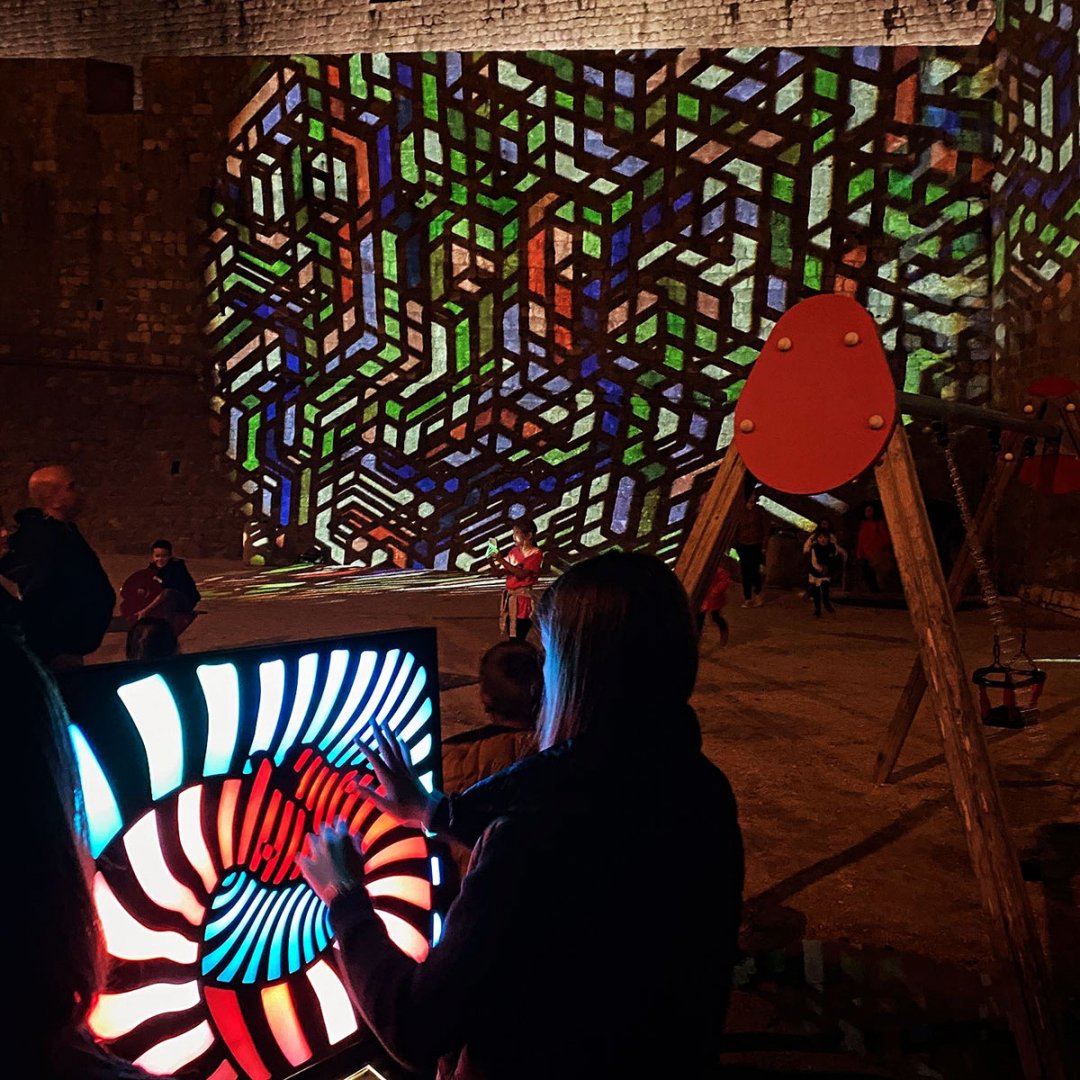 Vasarely inspired touch sensitive sculptures controlling the moire animation on the fortress walls.