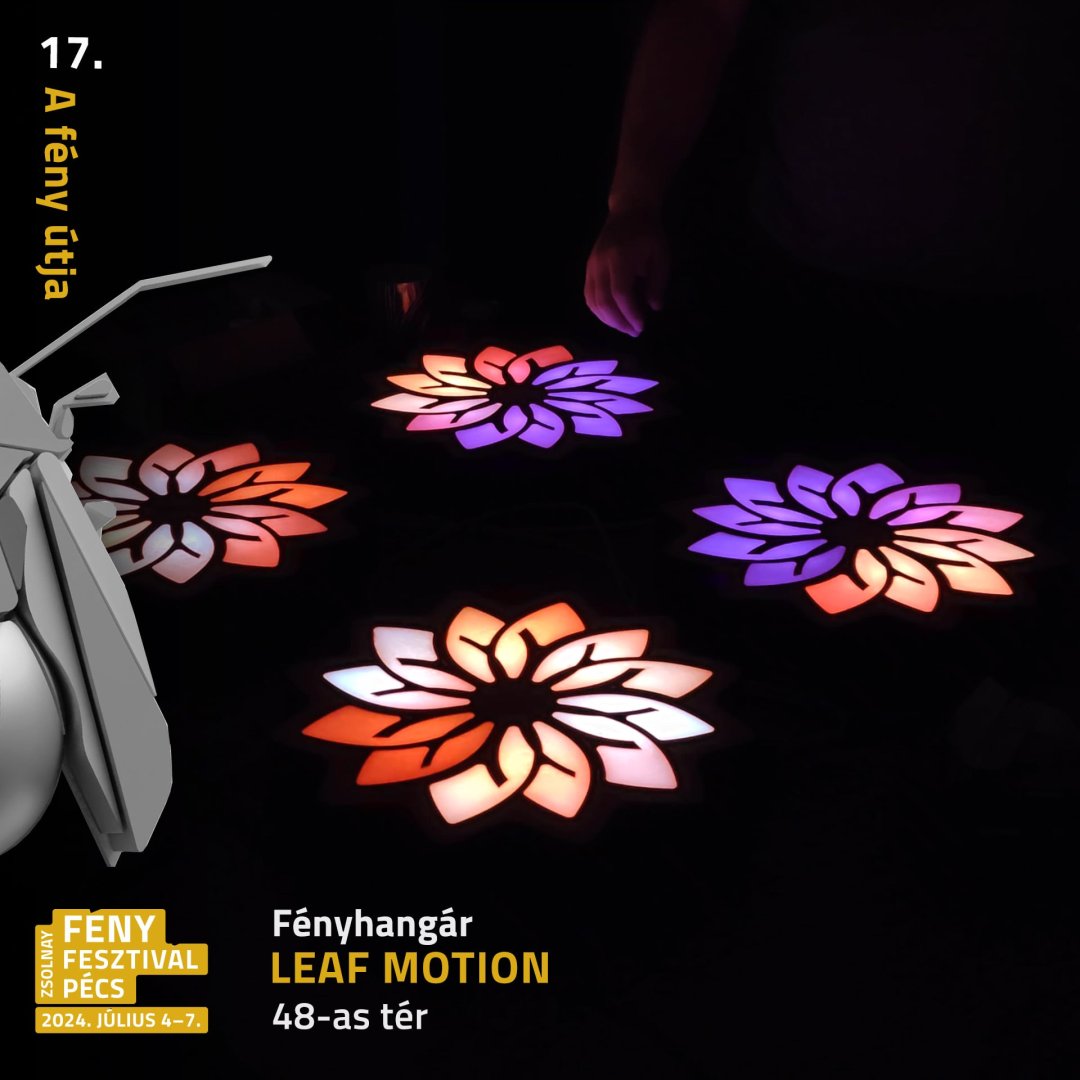6 ultrasonic distance measuring sensor in a row, facing upward. Each sensor controlled a transformation/fading in the projection. Made in cooperation with László Papp Pala.