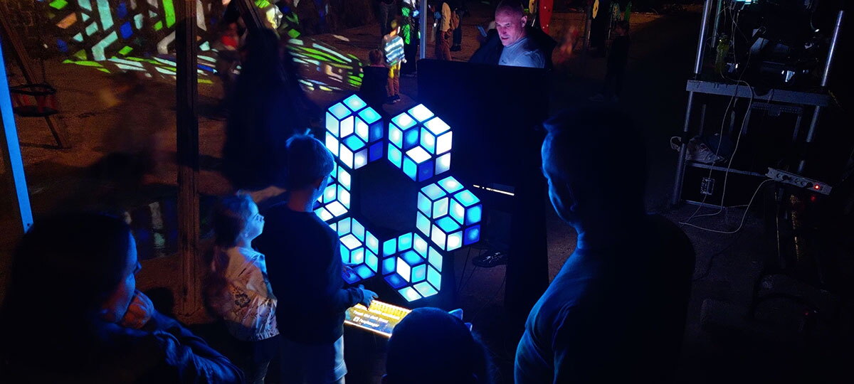 Vasarely inspired touch sensitive controllers with lots of built in effects. The touches controlled the projector.